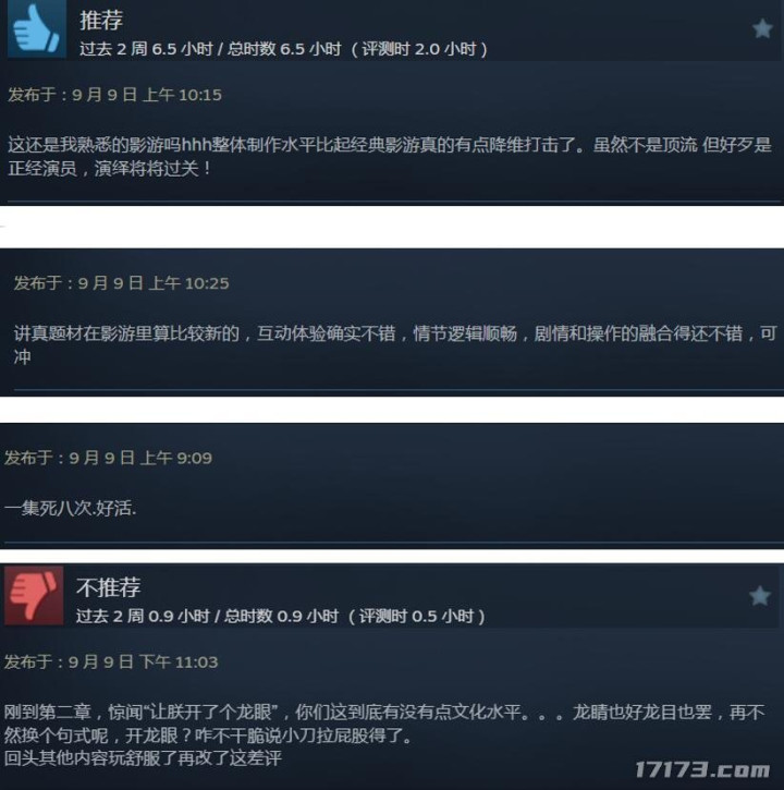 目前游戏steam好评率82%。有网友感慨,这款游戏的质量对其他影游来说是降维打击。也有网友表示题材新颖,游戏逻辑通顺,互动体验不错。还有玩家因为游戏权力斗争太真实,留言说玩一集死了八次。